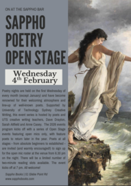 - Wednesday, 4 February at 6.30 pm: Sappho Poetry Open Stage -Poetry nights are held on the first Wednesday of every month (except January) and have become renowned for their welcoming atmosphere and line-up of well-known poets. Supported by University of Technology Sydney Creative Writing, this event series is hosted by poets and UTS creative writing teachers, Dave Drayton, Sarah Attfield and Anne Casey. The 2026 events program kicks off with a series of Open Stage events featuring open mics only, with feature poets to return later in the year. Poets at all stages - from absolute beginners to established - are invited (and warmly encouraged!) to sign up for the open mic roster at the venue from 6.30 pm on the night. There will be a limited number of two-minute reading slots available. The event kicks off at 7.00 pm. All welcome! Venue: Sappho Books, 51 Glebe Point Road, Glebe. Info: www.sapphobooks.com